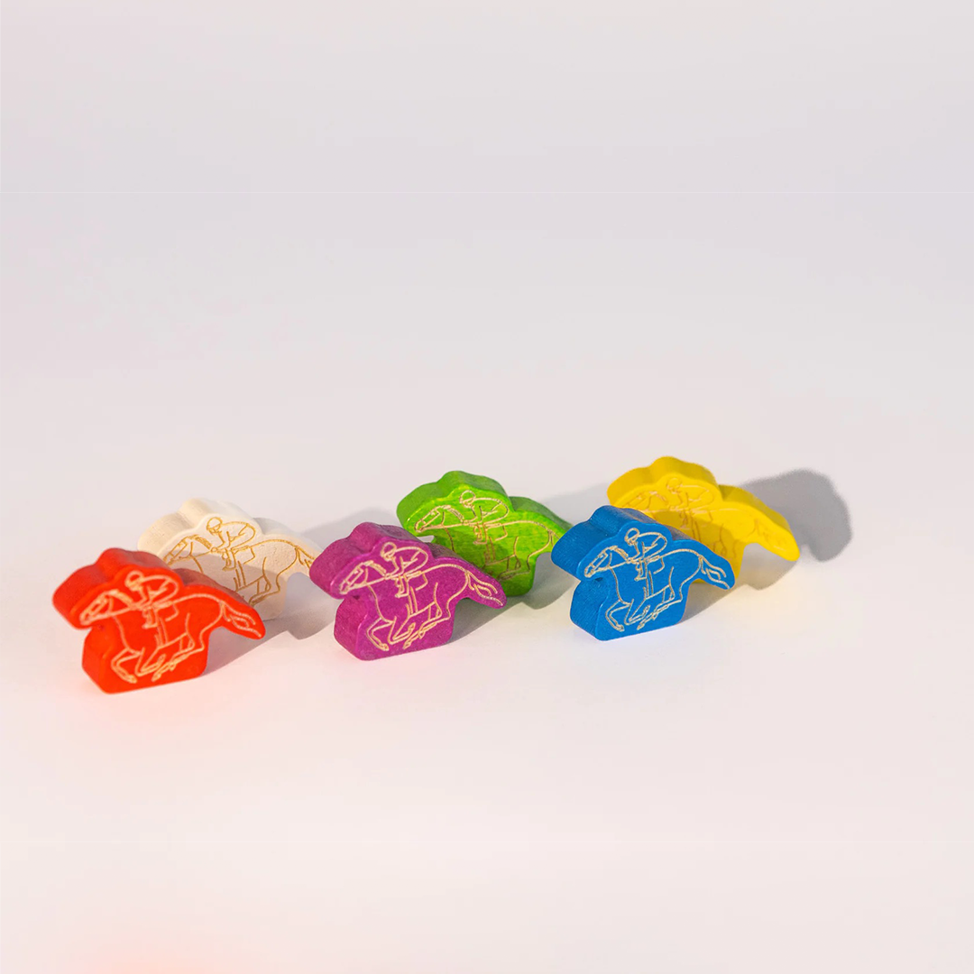Speciaal voor dé paardenstad bij uitstek heeft Mr. Monopoly exclusieve pionnen laten maken! Het gaat om een set van 6 pionnen; telkens een renpaard met jockey in 6 verschillende kleuren.